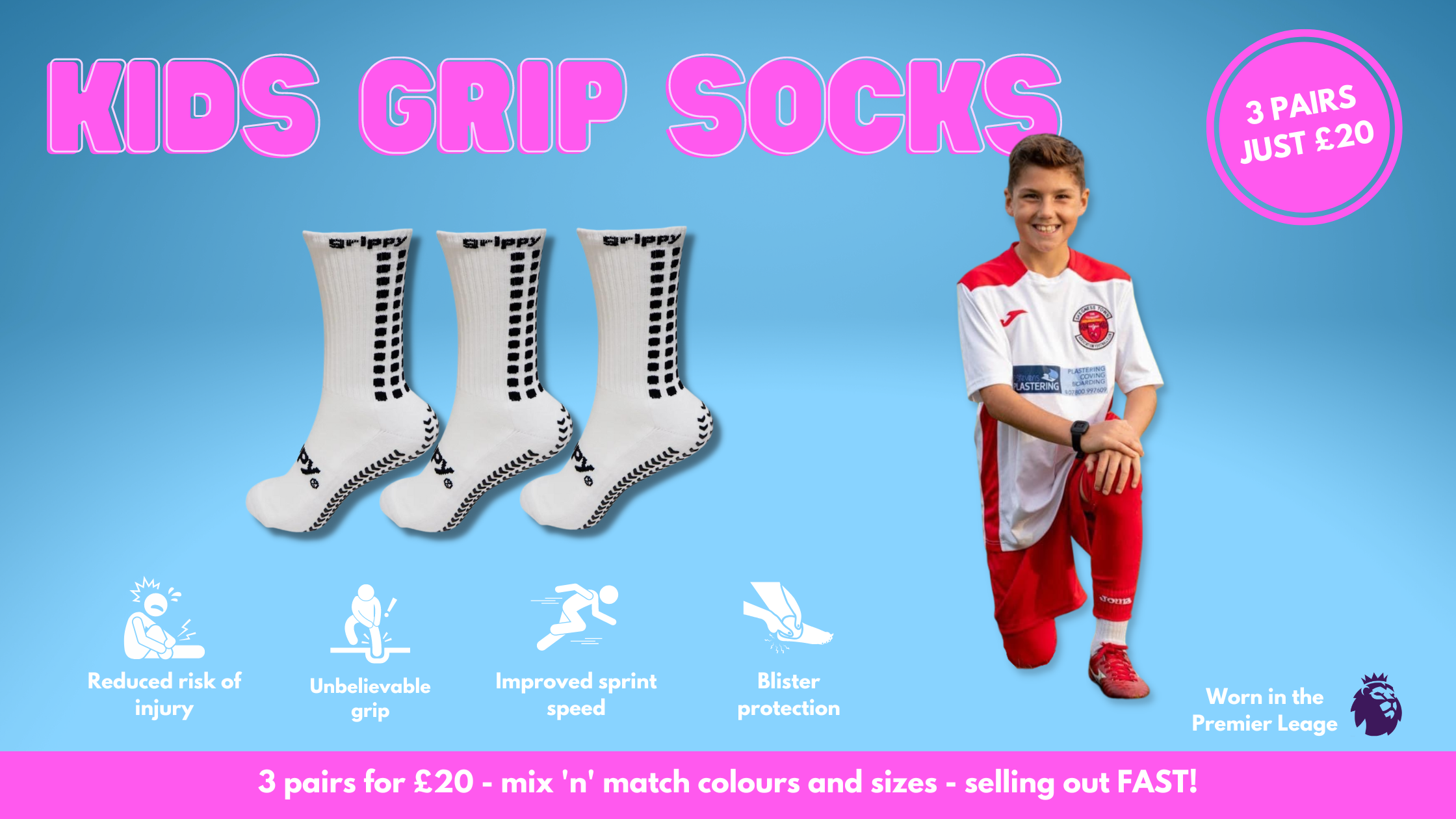 Our kids range is now available in a 4 colours and fit a UK size 3-6. You can order football grip socks now and have them in time for your next game. Children's grip socks are also eligible for our offer; if you add three pairs to your basket, we'll knock the price of one of them off at the checkout so you can 3 pairs of grip socks for the price of just 2!